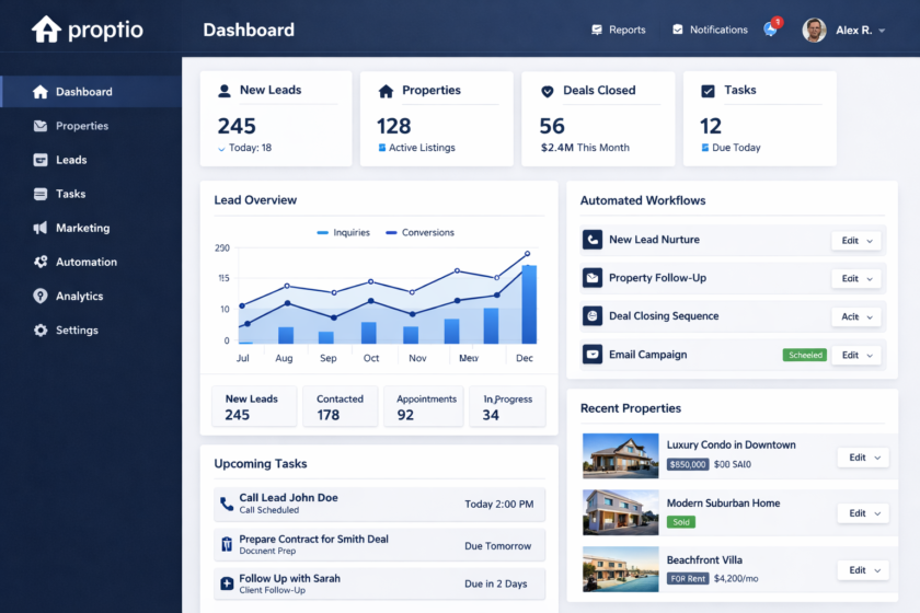 Proptio keeps your pipeline organized, automates follow-ups, and helps your team close faster — without messy spreadsheets or missed calls.